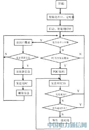 主程序是對整個系統框架的描述[3]。本系統主程序的功能是上電后,完成系統的初始化,然后等待PC端或TC35模塊端的命令到達,并根據命令的內容完成相應的動作,如發送或接收短信。流程圖如圖3。
