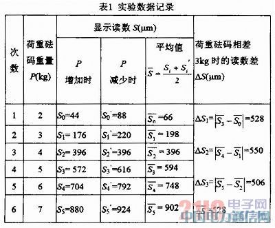 經(jīng)過實驗記錄及數(shù)據(jù)處理,我們?nèi)∥灰浦蹬c經(jīng)轉(zhuǎn)換放大后的電壓值的比例系數(shù)為44,在數(shù)據(jù)處理子程序中直接使用,用此系統(tǒng)去檢測金屬絲的伸長量,測得數(shù)據(jù)如表1所示。用千分尺測得鋼絲的直徑的數(shù)據(jù)如表2所示。