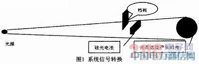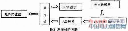 硬件部分主要有以下幾個模塊:由光源與硅光電池組成的光電轉(zhuǎn)換模塊;由TL084芯片及其外圍元件組成的電流一電壓轉(zhuǎn)換及其放大、濾波模塊;AD轉(zhuǎn)換模塊;最后是由單片機(jī)和LCD組成的數(shù)據(jù)處理及輸出模塊,如圖2所示。下面簡述一下前兩個模塊。