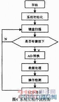為了方便程序調(diào)試和提高可靠性,程序設(shè)計采用自上而下、模塊化、結(jié)構(gòu)化的程序設(shè)計方法。本設(shè)計按任務(wù)模塊劃分的程序主要有初始化程序、主程序、A/D轉(zhuǎn)換子程序、數(shù)據(jù)處理子程序(包括調(diào)零、判斷操作是否錯誤、位移值及楊氏模量值)、LCD顯示子程序、鍵盤掃描子程序。系統(tǒng)主程序流程圖如圖4所示,其中操作檢測是幫助提醒操作者,若無誤,LCD顯示會顯示功能按鍵相應(yīng)的數(shù)據(jù)值,若操作有誤,LCD顯示會顯示EOF字樣。