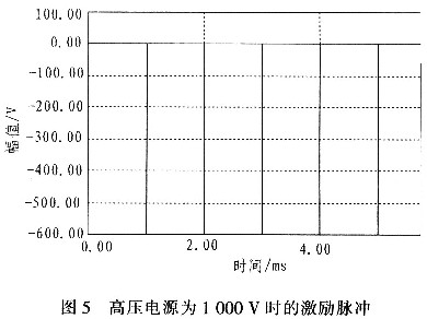 圖5中,當高壓電源輸出最大為1000V,R1=10kΩ,R2=100Ω,C=0.01μF時,得到的激勵脈沖約為830V,寬度為600ns。