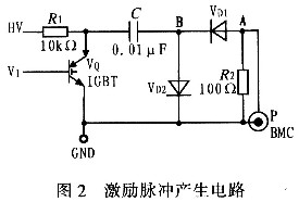 3)快速恢復型二極管Vd1、Vd2濾去充電脈沖,使A點只有放電時的負電壓激勵脈沖。