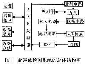 基于ARM超聲波檢測系統的總體結構框圖,如圖1所示。該系統主要由3部分組成:超聲波前端發射接收電路、DSP和ARM處理器。