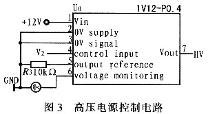 這里采用美國Ultravoh公司的高壓電源模塊。其中“V”系列的型號為1V12-P0.4電源模塊,能完全滿足該設計的需求,其輸入電壓為12V,輸出電壓為0~1000V,控制電壓為0~5V,功率為0.4W。低功耗、體積小、重量輕,并帶有輸出電壓監測和自保護電路。高壓電源控制電路如圖3所示。