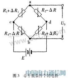 壓阻式壓力傳感器芯體如圖1,R1,R2,R3,R4是4片電阻片,當(dāng)受外力作用時(shí),電阻片R1,R3亦受拉伸作用電阻增大,R2,R4電阻減小,這樣外力F的作用使4個(gè)電阻片電阻值發(fā)生變化。傳感器上的電阻R1,R2,B3,R4接成圖2所示的直流橋路。cd兩端接穩(wěn)壓電源E,ab兩端為電橋電壓輸出端,輸出電壓為U0,如圖2。