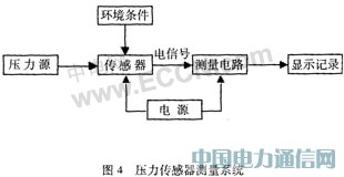 壓力傳感器測量系統(tǒng)主要同由壓力源、被測試壓力傳感器、測量電路和顯示記錄四部分組成,它們的關(guān)系如圖4所示。