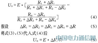 式(2)就是電橋平衡條件。在傳感器上貼的電阻片是相同的4片電阻片,在理想狀態(tài)下,設(shè)其電阻值相同,即有