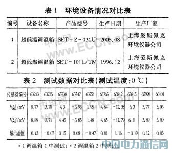 現(xiàn)以使用我單位的傳感器測試沒備對壓力傳感器的測試為例:在其他測試條件相同的情況下,使用兩臺不同的環(huán)境設(shè)備分別對10臺未補(bǔ)償?shù)膲毫鞲衅鬟M(jìn)行零點(diǎn)溫度測試。兩臺烘箱的參數(shù)指標(biāo)見表1,傳感器的測試數(shù)據(jù)見表2。