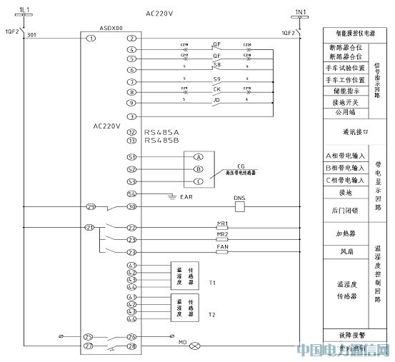 在某水泥廠高壓開關柜設計中,全部采用了ASD系列開關柜智能測控裝置。應用方案見圖5。圖中信號指示回路通過開關量輸入采集來實現一次原理圖指示;帶電顯示回路通過高壓傳感器輸入來指示母線是否帶電;溫濕度控制回路通過溫濕度傳感器輸入來實現溫濕度控制。并帶有Modbus通訊輸出, 供用戶遠程監測和控制。一改以往每個開關柜需配備不同廠家的多種產品,既減少了工程量節約了成本,又提高了系統的可靠性。投入試用的開關柜智能測控裝置以其良好的穩定性和可靠性能保證了對開關柜內的一次設備的保護,并且保證了對于電壓、電流、功率等參數的準確測量和對電能的準確計量,同時方便了用戶對開關柜的實時監控。