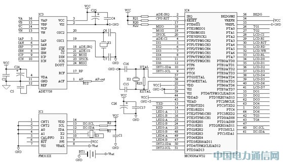 電能計量芯片采用美國ADI公司的高精確度三相電能測量芯片ADE7758。該芯片的測量精度高,功能強大。該IC內嵌高精度的模數轉換器和固定模式的數字處理信號處理器( DSP),具有數字積分、數字濾波、實用電能監測、計量功能。芯片帶有一個SPI串行口、有功電能脈沖輸出、無功電能脈沖輸出,可用于各種三相系統中有功功率、無功功率、電能、電壓電流有效值的測量以及以數字方式校正系統誤差所必須的信號處理電路。