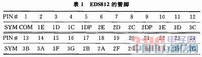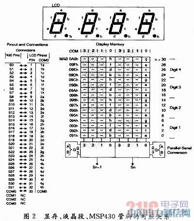 MSP430F413帶有液晶驅動電路和顯示緩存,通過對顯存中各位的置位和復位來使得液晶屏上對應的段顯示或消失,將斜率轉換后得到的數據發送到顯存,就可以在液晶屏上顯示出測得的溫度。MSP430有4種驅動方式,選用哪種驅動方式由需要驅動的液晶段數以及液晶屏的管腳和液晶屏內部電極的排布決定。本系統采用的液晶屏是大連東顯電子有限公司生產的EDS812液晶顯示屏。該顯示屏可以顯示3位數字,有24個管腳,其中1個公共極管腳,23個段極管腳。由于該液晶屏只有1個公共極,只能采用靜態驅動方式。根據圖2和表1所示的對應關系連接MSP4 30和EDS812,并將數據寫入顯存,即可顯示出測得的溫度。