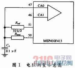 應用MSP430的比較器(Comparator_A)和定時器(Timer_A),可以測量熱敏電阻的阻值。根據阻值和溫度的對應關系可以得出待測的溫度,實現A/D轉換。將Comparator_A的CA0端接外部信號,CA1端接內部參考電壓0.25Vcc。Timer_A工作在捕獲模式,下降沿捕獲,通過CCI1B捕獲CAOUT。先使P1.2端口輸出高電平,通過Rref給電容C6充電。充電完畢時,CA0端電壓高于CA1端電壓,CAOUT輸出1。讀Timer_A的計數值t0,t0=TAR。然后再使P1.2端口輸出低電平,電容C6通過Rref放電,當CA0端電壓降至0.25Vcc時,Comparator_A輸出翻轉,CAOUT輸出0,Timer_A通過CCI1B捕獲到下降沿,觸發定時器中斷,讀出捕獲值CCR1,t1=CCR1。C6通過Rref放電到0.25Vcc的時間time_ref=t1-t0。再對熱敏電阻Rsens充電和放電,同樣測出C6通過Rsens放電到0.25Vcc的時間time_sens。由下面的公式可以計算出熱敏電阻(Rsens)的阻值。
