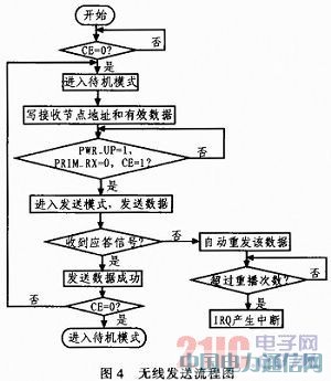 nRF24L01的發(fā)送模式的程序流程圖如圖4所示。