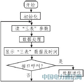 軟件由初始化、數據處理、信號顯示、數據通信、鍵盤處理及數據存儲幾部分構成。初始化完成對單片機各功能部件初始狀態及中斷的設置和DS1302控制寄存器的初始化配置并開啟芯片軟件看門狗功能;數據處理主要完成采集數據計算;數據通信完成計量系統與單元集中器間的協議化通信,按照通訊協議的要求實現與單元集中器的可靠通訊,以便單元集中器來讀取客戶的數據以及設置時間、費率和地址等參數:信號顯示通過LCD實時顯示時間、“三表”數據等;鍵盤處理是按預定鍵值對ADE7751的相關引腳進行配置,設置系統的工作狀態,完成時間的校正、查詢及顯示等功能。系統軟件流程如圖3所示。