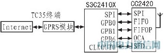 系統主要由主控制器、GPRS模塊和ZigBee射頻通信模塊3部分組成,其結構框圖如圖2所示。主控制器采用三星公司的ARM9微處理器S3C24-10X,它具有外圍擴展功能模塊,能夠實現高速處理。GPRS模塊采用Siemens公司的TC35終端,通過串口與CPU相連,實現與Internet的連接。ZigBee射頻收發模塊采用Chipcon AS公司的CC2420芯片,控制采集器內具備ZigBee標準接口的檢測設備。
