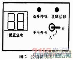 設計控制面板按鈕應最少化,并且使用方便,功能合理,控制操作簡便,儀表能顯示出設置的溫度。控制面板如圖2所示,面板左側的2位LED數碼管用來顯示預置的用水溫度。面板右上方的溫升按鍵、溫降按鍵分別用來增加和減少預置出來水溫的溫度。面板右下方為手動開關,決定水閥的開關和出水量大小,當其置于“關”時,為關閉出水非工作狀態。