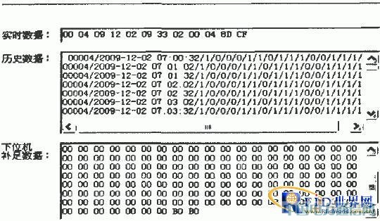 數(shù)據(jù)中心服務(wù)器接收PLC實(shí)時(shí)數(shù)據(jù)的界面如圖4所示。可以看出,接收的實(shí)時(shí)數(shù)據(jù)有12個(gè)字節(jié),以16進(jìn)制顯示。在實(shí)時(shí)數(shù)據(jù)框中,00 04表示機(jī)器碼,09 12 02 09 33 02 00 04,表示09年12月02日09點(diǎn)33分02秒,00系統(tǒng)保留位,04表示星期三,8D CF表示設(shè)備的開(kāi)關(guān)信息。在歷史數(shù)據(jù)框中,可以看到每隔30 s接收到的PLC的實(shí)時(shí)數(shù)據(jù),1表示設(shè)備開(kāi),0表示設(shè)備關(guān)。在下位機(jī)補(bǔ)足數(shù)據(jù)框中,是數(shù)據(jù)中心服務(wù)器檢測(cè)到數(shù)據(jù)庫(kù)中某個(gè)時(shí)間段的數(shù)據(jù)有缺失時(shí),進(jìn)行數(shù)據(jù)補(bǔ)足查詢(xún),得到的一段歷史數(shù)據(jù)。