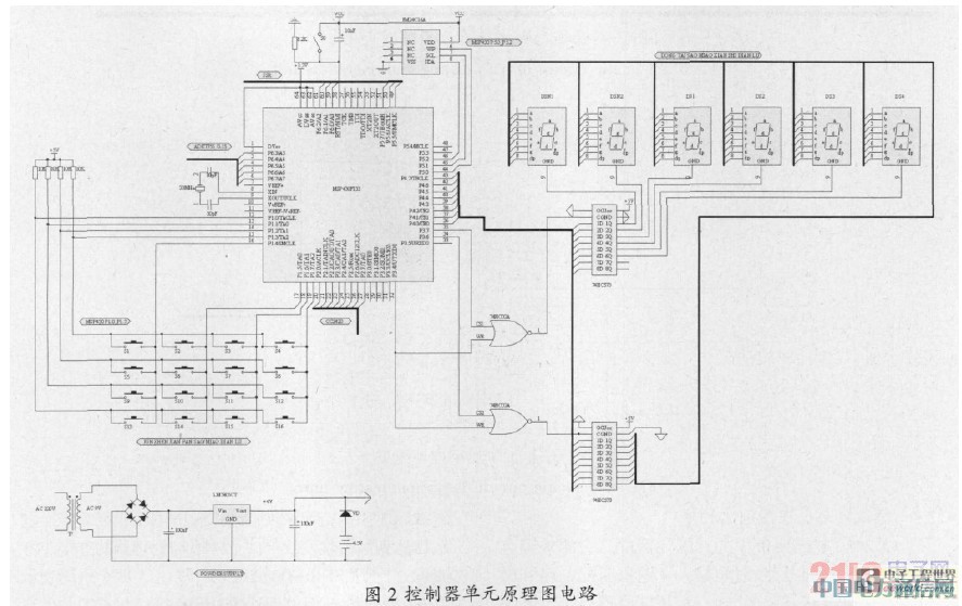 系統供電采用LM7805整流后的+3.3V直流電源,以+4.5V電池組作為后備電源;系統采用4×4矩陣鍵盤進行參數設置;外擴了FM24C16以增加系統數據儲能力;用戶的用電量顯示可精確到最新10m內的用電量,采用6只共陰極LED數碼管構成的動態掃描顯示電路第一位采用16進制數字表示16個用戶,其后的5位數字顯示相應用戶的當前用電量,精度可以精確到小數點后2位數。也可以將其用電量數據經單片機處理后直接循環逐次顯示當前用電費用,采用不同時刻不同費率的計算處理手段同時可以實現計費復費率功能。其具體硬件原理連接電路圖如圖2所示。