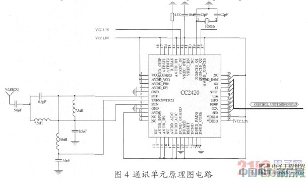 CC2420內部使用1.8V工作電壓,因而功耗很低,適合于電池供電的設備;外部數字I/O接口使用3.3V電壓,這樣對于只有3.3V電源的設備,不需要額外的電壓轉換電路就能正常工作。CC2420射頻信號的收發采用差分方式傳送,其最佳差分負載是115+j180,阻抗匹配電路應該根據這個數值進行調整。如果使用單端天線則需要使用平衡/非平衡轉換電路,以達到最佳收發效果。CC2420與處理器的連接非常方便。它使用SDF、FIFO、FIFOP、和CCA四個引腳表示收發數據的狀態;而處理器通過SPI接口與CC242O交換數據、發送命令等;CC2420通過4線SPI總線(SI、SO、SCLK、CSn)設置芯片的工作模式并實現讀/寫緩存數據、讀/寫狀態寄存器等。通過控制FIFO和FIFOP管腳接口的狀態可設置發射/接收緩存器。