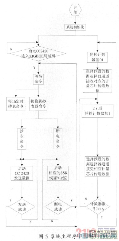 系統進程首先進行初始化,成功后的進程分為并列的兩部分。其一是各戶用電量的上抄:單片機內輪抄計數器置01,MSP430F133對74LS150的ABCD四個控制端置0000位,此時引腳EA0對應的通道接通到MSP430F133的輸入端,單片機統計其在32s內積累的脈沖數。2s后,輪抄計數器加1為02,ABCD置1000位,EA1對應通道接通,進行相應用戶的計數積累脈沖的上抄,以此循環進行相應用戶的抄送,當輪抄計數器的數目=16時,完成總共16戶的上抄,將輪抄計數器的置01,進行下一輪循環的上抄。總體上講,整個電表系統32s為一個循環,對用戶用電量進行循環抄送,每10m將各用戶累加器單元統計的累積脈沖計算轉換為電量數據(用電量=脈沖數×16×儀表脈沖/功率輸出常數,因統計脈沖數是真實值的1/16)并附屬時間常數存儲到對應的存儲器單元,并且實時顯示最新10m內的用電量/用電費用,每1h末進行用電數據(用電量和對應的時間常數)的定時傳送,其二是電表數據的上傳和斷電的執行:啟動CC2420連入ZigBee局域網,成功后等待上層集中器命令,一旦網絡斷開立即重啟CC2420重新連入局域網絡;上層集中器下載的命令分為數據上傳和欠費斷電兩種,若是斷電命令,MSP430F133控制相應用戶的SSR斷開電源連接,成功后自動轉為待命狀態,若不成功,重復進行斷電操作直至操作成功。若是上傳命令,MSP430F133立即將累加器內積累脈沖轉化為電量數據附上時間常數存儲到對應的存儲器單元,然后將前1h末到此刻RAM內的存儲數據通過CC2420以ZigBee通訊的方式上傳到上位集中器。成功后自動轉入待命狀態。