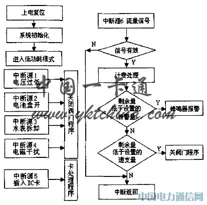 IC卡智能水表軟件設計采用了模塊化處理,主控程序包括:系統初始化、狀態判斷、流量脈沖和用水量處理、報警提示和低功耗模式處理等,其中關鍵是計費處理部分和看門狗的初始化。功能子程序包括:IC卡的接IZl模塊(包括IC卡有效性判斷、讀/寫及IC卡的解密與加密)、計費處理模塊(包括階梯水價分段計費判斷及處理)及閥門控制模塊等。系統的主程序流程圖,如圖4所示。