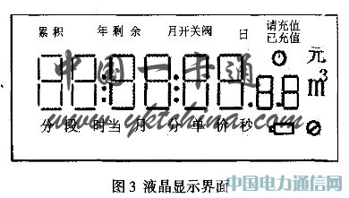 (3)液晶顯示器。液晶顯示器作為水表的輸出接口,主要作用是輸出水表的各種運行狀態,及相關數據;此外還具有用戶提示的功能。為了降低功耗、節約成本,在設計時采用的是專門定制的液晶顯示器。其界面如圖3:
