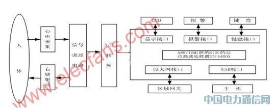 系統硬件模塊主要包括:信號調理電路(放大器、帶通濾波器、陷波器)、嵌入式處理器及外圍電路(A/D轉換、Flash ROM和SDRM擴展、液晶顯示LCD和鍵盤模塊、以太網模塊)兩大部分。其結構和原理圖如下: