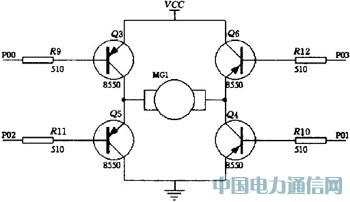 本系統將以不同的電機做出不同的動作,來模擬說明智能家居對系統控制的響應。如圖5所示,當分機的單片機收到本機的地址信息,便提取信息中的數據,根據數據的命令,若把P0.0,P0.1腳置成低電平,其他為高電平,則Q3、Q4管導通,電機便正向旋轉,若把P0.2,P0.3腳置成低電平,其他為高電平,則Q5、Q6管導通,電機便反向旋轉(以前一情況為正向時)。若一臺分機上連多個電機,有多臺分機,便可以實現在智能家居環境中對家庭各個設備的同步控制。