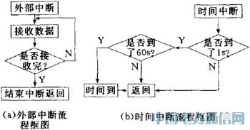 為了確保主機正常工作。加入主機等待分機回復的等待時間。而為了時間的實時性和準確性,用到單片機內部的定時器1.設定其工作模式為模式1,初值為Ox4bff(5Oms)。中斷20次為1s,60次循環為60s,當60s到時,標志位置位后返回。時間中斷流程圖如圖7(b)所示。