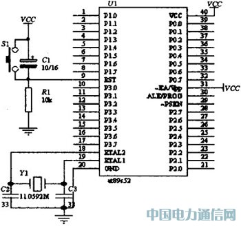 本單片機通過RS232串行通信接口與GSM模塊通信,提取GSM設備的短信,發送相關的信息,并通過串行通信接口與紅外模塊相連,利用紅外模塊,達到主、分機之間的通信,因此,選用AT89S52芯片。控制上需要用到兩個串行接口,但89S52只有一個串口,故還需要在程序中進行模擬串行接口通信。其最簡外部接線電路如圖2所示。