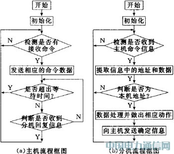 分機上電復位后進行初始化,然后等待接收主機發送的命令信息。接收到命令信息后,從中提取地址和數據信息,若為本分機地址,則對數據進行處理并作出響應,同時向主機發送確定信息;若非本分機地址,則返回,繼續等待主機發送的命令信息。分機主程序流程圖如圖6(b)所示。