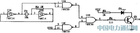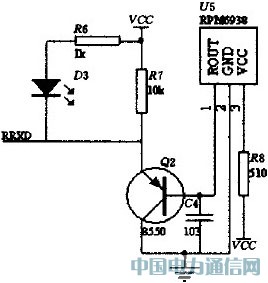 紅外接收器電路如圖4所示,當接收器收到數位"O"時,Q2管導通,使得RXD接收到低電平,收到數位"1"時,Q2管截至,RXD接收到高電平。