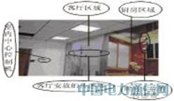 系統測試的地點選擇在按家居環境布局的展示廳。在展示廳的入門處安置一個室內中心控制機。將WIA-PA網關放置在門后的交換機箱內,按照房間(客廳、廚房)的布局,布置各傳感器,在客廳中安放WIA-PA路由器及WIA-PA溫、濕度傳感器、WIA-PA煙霧傳感器、WIA-PA一氧化碳傳感器;在廚房中安放WIA-PA路由器、WIA-PA溫、濕度傳感器及WIA-PA甲烷傳感器。系統測試環境圖如圖5所示。