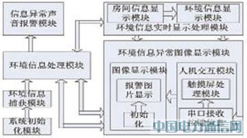 智能家居的家居環境實時監測報警系統中的核心是室內中心控制機。室內中心控制機主要負責家居環境信息的接收、轉發、處理,并協調、控制各模塊正常工作的重要設備。因而室內中心控制機主要有以下功能模塊:室內中心控制機系統初始化模塊、環境信息捕獲模塊、環境信息處理模塊、環境信息實時顯示處理模塊、信息異常聲音報警模塊、環境信息異常圖像顯示模塊。其中室內中心控制機的軟件架構圖如圖3所示。
