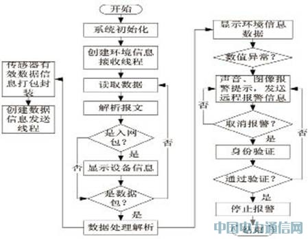 系統初始化完成以后,室內中心控制機創建數據接收線程獲取家居環境信息。傳感器會發送兩種數據包:一個是入網包,一個是數據包。收到入網包后,通過解析確定是哪個傳感器上線,然后在室內中心機的相應界面上顯示相應傳感器的名稱。收到數據包后,進行數據包的處理提出有效數據信息,計算出傳感器的值,并在室內中心控制機上進行傳感器數值的實時顯示。同時將收到環境信息發送到遠程監控中心,進行信息的及時更新和顯示。當室內溫度過高或者煙霧濃度、有害氣的含量超標時,室內中心控制機將進行實時的本地報警同時將報警信息發送到遠端監控主機上。室內中心控制機軟件主流程圖如圖4所示。
