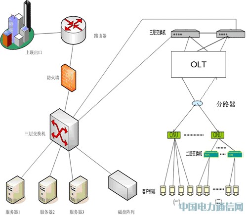 當前業務比較簡單,該縣電子政務承載網規劃的核心是EPON光路的設計,VLAN規劃和安全可靠性的考慮。