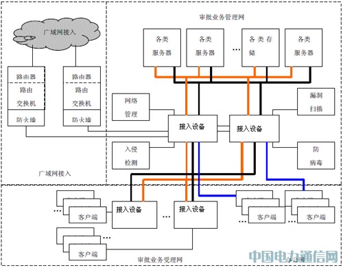 圖1為電子政務承載網總體架構圖,按照實現的功能,可以分為接入承載、辦公區、業務管理區、業務處理區、外聯網絡區等部分。