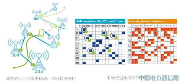 ANR盡管目前在LTE還沒有商用,但在多個歐美運營商的測試中,愛立信產品表現良好。如下圖ANR測試中,僅使用一個移動終端在20分鐘內通過了20個基站覆蓋區域,檢測到的鄰區關系如藍圖所示,相比橙色圖的手工配置鄰區,所有必要的鄰區關系(有數字標示)悉數獲得。而且這僅僅動用了一個終端,如果相關區域內都有終端分布,檢測的速度會有極大提高。