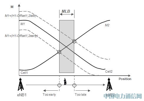 過早、過晚切換是由于目標小區切換門限過低和過高所致。對應過早和過晚臨界切換門限之間的區間就是合理的移動性優化范圍。頻內的負載均衡也可以通過調整切換門限值來引導用戶和負荷由高負荷小區遷移至低負荷小區,很顯然可調的門限區間就是移動性優化允許的范圍。這個范圍對應相鄰小區的重覆蓋面積,在LTE中理論上大概相當于正常小區面積的15%,可操作的價值不是很大。愛立信更傾向于異頻或者異系統的負荷均衡方案,增益比較明顯。如下圖,一個終端從左至右移動,M1、M2分別是接收到eNB1和eNB2的信號強度曲線,兩條曲線相交點對應的地理位置處終端接收到的信號強度相同,對cell1到cell2的切換,下面的虛線對應過早切換臨界,上面的虛線對應過晚切換臨界,兩線與M2相交點對應合理切換門限區間,也是頻內負載均衡MLB的可調范圍。