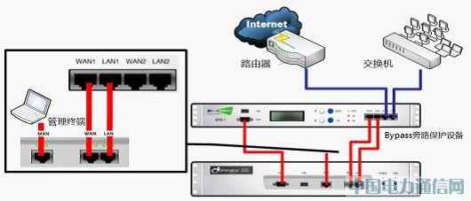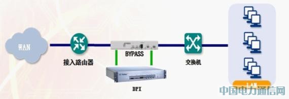 將ByPass串聯入網絡,再將網絡設備并聯在ByPass設備上,將ByPass與DPI各自的串行通訊口相連接,實時監控DPI運行狀態。DPI設備正常工作時網絡由其連通,一旦出現故障或者掉電,ByPass便即刻切換到保護狀態,實時保護網絡。