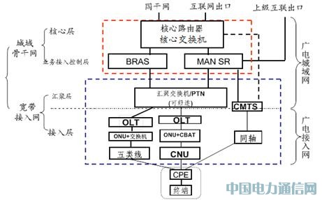 廣電城域網分為交換機組網方式和路由器組網方式;廣電接入網由于接入方式多樣,包括有XPON+LAN(FTTB+LAN),XPON+EOC,CMTS。
