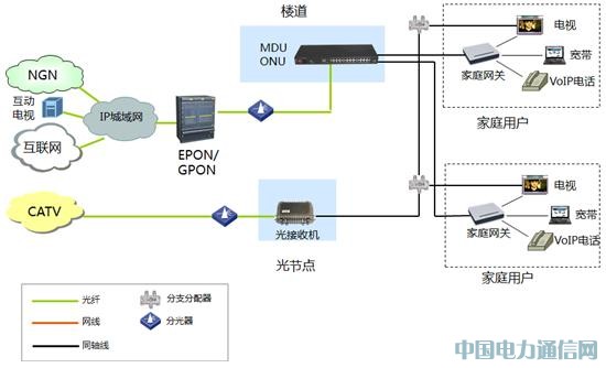 如上圖所示,IP城域網具備多業務能力,通過PON+LAN實現綜合業務的光纖接入。在樓道部署帶PON口上行的MDU系列ONU設備。樓道交換機經五類線入戶,通過家庭網關提供互動電視、寬帶和VoIP電話業務的接入。CATV網絡方面,利用現有的系統和線路提供傳統的有線或者數字電視業務。