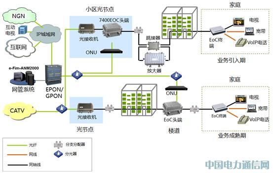 上圖為PON+EoC承載三網融合業務的大致拓撲圖。廣電IP城域網通過NGN核心網支持VoIP語音業務,通過連接互聯網骨干網支持寬帶上網業務,通過互動電視業務平臺支持VoD、時移電視等新興視頻業務,通過不斷發展的CATV網絡支持數字電視業務。