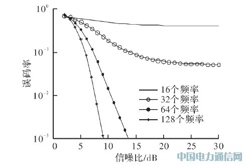 在圖2中,畫(huà)出了用戶(hù)數(shù)為N=10,M=16、M=32、M=64、M=128的條件下,誤碼率隨信噪比的變化曲線。由圖可以看出,可用頻點(diǎn)數(shù)M越高,誤碼率隨信噪比的變化越快,且M越大,相應(yīng)信噪比條件下的誤碼率越小,系統(tǒng)性能越好。