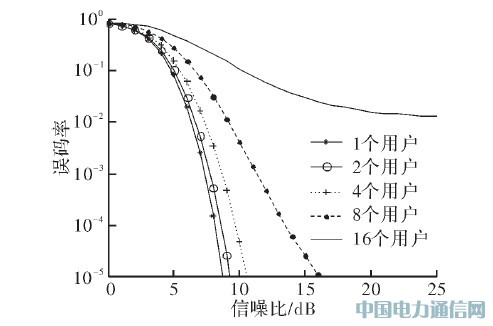 在圖3,中使用Matlab分別畫(huà)出了用戶(hù)數(shù)N=1、N=2、N=4、N=8、N=16時(shí),DFH系統(tǒng)誤碼率隨信噪比的變化圖。由圖可以看出,用戶(hù)越多,DFH系統(tǒng)的誤碼率越大,信噪比曲線越平緩,即誤碼率隨信噪比變化的速度較慢;用戶(hù)越少誤碼率越小,信噪比曲線就越陡峭,即誤碼率隨信噪比變化的速度較快;此外,系統(tǒng)用戶(hù)數(shù)越少,在相應(yīng)信噪比條件下誤碼率越小,說(shuō)明干擾小。