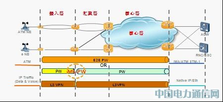 TDM E1和ATM E1:對于采用TDM E1和ATM E1接入的基站業務來講,可以采用端到端的PW隧道承載,也可以在接入層和匯聚層采用分段PW進行承載;在接入層設備電路仿真和PW封裝,在核心設備終結PW,把數據解封裝,通過E1或ATM接口與業務系統互通。