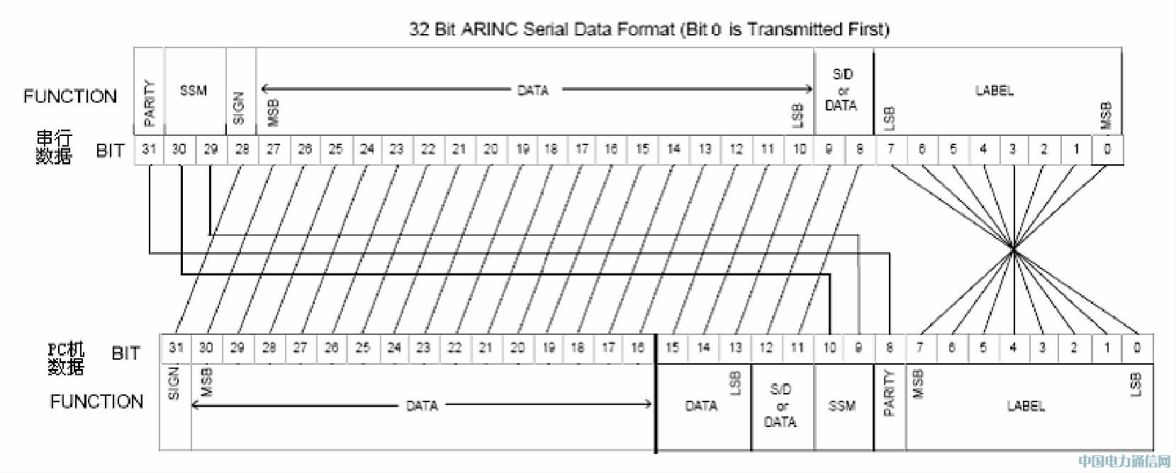 ARINC429是一種廣泛應用于民用和軍用飛機的串行數據總線結構,是一種單向廣播式數據總線,其傳輸介質為屏蔽雙絞線,調制方式采用雙極歸零制的三態碼方式,具有很強的抗干擾能力。數據傳輸采用廣播傳輸原理,按開環進行傳輸,傳輸速率有兩種:高速傳輸率為100kb ps±1%,低速傳輸率為12~14.5 kbps±1%.ARINC429規范規定,一個數據字有32位。數據字有5種形式:二進制補碼(BNR)數據、十進制(BCD)數據、離散數據、維護數據、AIM(即應答、ISO5號字母表和用ISO5號字母表表示的維護數據)數據。它們被分為5段,如圖1所示。