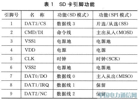 SD卡的外形如圖1所示,引腳功能如表1所列。SD卡的引腳具有雙重功能,既可工作在SD模式,也可工作在SPI模式。不同的模式下,引腳的功能不同。