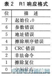 SD卡的每條命令都會返回對應的響應類型。在SPI模式下,共有3種響應類型:R1、R2和R3,分別占1、2和3個字節。這里僅列出了R1響應的格式,如表2所列。當出現表中所描述的狀態時,相應的位置1。R2和R3的第1個字節格式與R1完全一樣,詳細內容請參考SD卡標準。