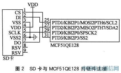 由于MCF51QE128是一款低功耗的微控制器,工作電壓的典型值為3.6 V,與SD卡的工作電壓兼容,因而可以直接與SD卡連接,無需電平轉換電路。這里選用的是MCF51 QE128的第2個SPI口,硬件連接如圖2所示。